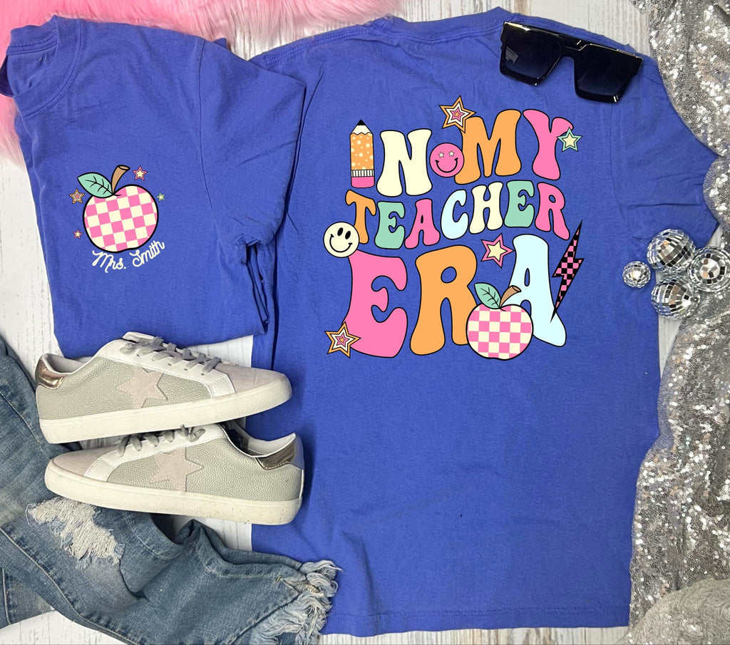 *DTF* *CUSTOM* In My Teacher Era Front Pocket & Big On Back on Flo Blue Comfort Color (Copy)