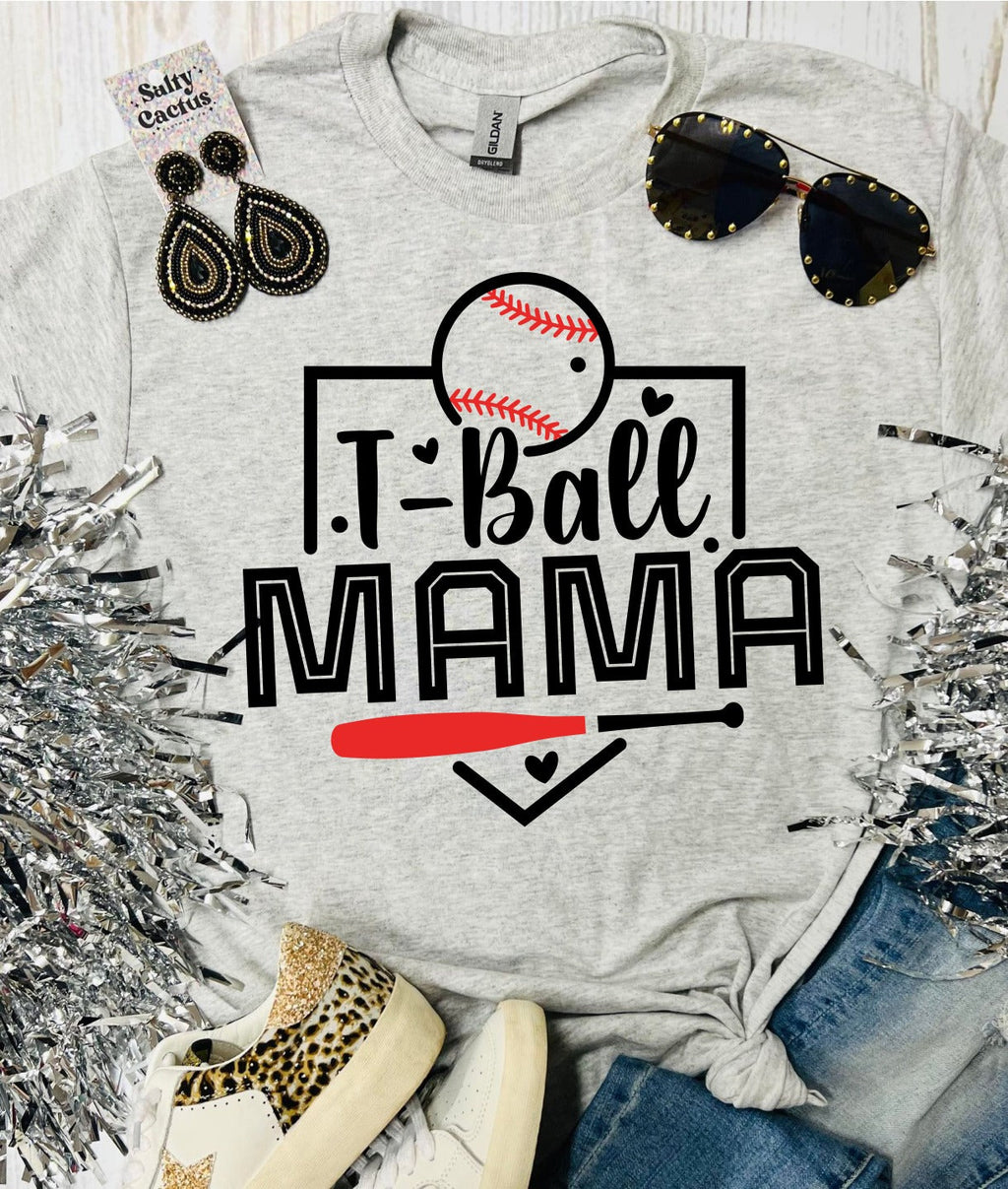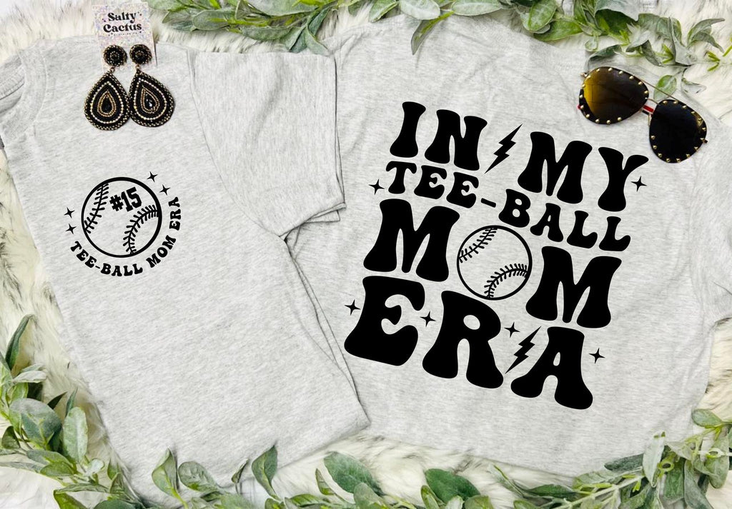 *CUSTOM* Tee-Ball Mom Era Front Pocket and Big On Back Design Ash Grey Tee